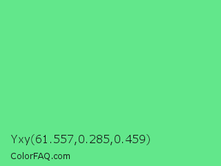 Yxy 61.557,0.285,0.459 Color is a light green color and the nearest color is Very Light Malachite Green #64e986. Hex code #62e78b and RGB value is rgb(98,231,139). In RGB color space, this color is composed of 38% red, 91% green, 55% blue, In CMYK color space, this color is composed of 58% cyan, 0% magenta, 40% yellow , 9% black , In HSL color space, this color has a hue angle of 138° , 73% saturation and 65% lightness.