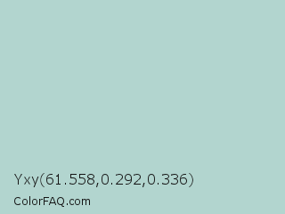 Yxy 61.558,0.292,0.336 Color is a light cyan color and the nearest color is Jet Stream #b5d2ce. Hex code #b2d5cf and RGB value is rgb(178,213,207). In RGB color space, this color is composed of 70% red, 84% green, 81% blue, In CMYK color space, this color is composed of 16% cyan, 0% magenta, 3% yellow , 16% black , In HSL color space, this color has a hue angle of 170° , 29% saturation and 77% lightness.