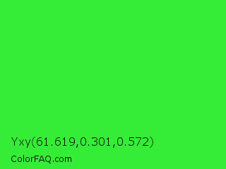 Yxy 61.619,0.301,0.572 Color is a normal green color and the nearest color is Lime Green #32cd32. Hex code #35ed36 and RGB value is rgb(53,237,54). In RGB color space, this color is composed of 21% red, 93% green, 21% blue, In CMYK color space, this color is composed of 78% cyan, 0% magenta, 77% yellow , 7% black , In HSL color space, this color has a hue angle of 120° , 84% saturation and 57% lightness.