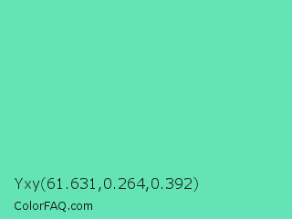Yxy 61.631,0.264,0.392 Color is a light green color and the nearest color is Medium Aquamarine #66ddaa. Hex code #64e4b6 and RGB value is rgb(100,228,182). In RGB color space, this color is composed of 39% red, 89% green, 71% blue, In CMYK color space, this color is composed of 56% cyan, 0% magenta, 20% yellow , 11% black , In HSL color space, this color has a hue angle of 158° , 70% saturation and 64% lightness.
