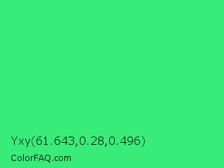 Yxy 61.643,0.28,0.496 Color is a normal green color and the nearest color is UFO Green #3cd070. Hex code #39eb78 and RGB value is rgb(57,235,120). In RGB color space, this color is composed of 22% red, 92% green, 47% blue, In CMYK color space, this color is composed of 76% cyan, 0% magenta, 49% yellow , 8% black , In HSL color space, this color has a hue angle of 141° , 82% saturation and 57% lightness.