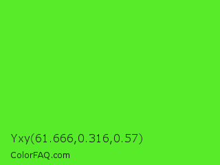 Yxy 61.666,0.316,0.57 Color is a normal green color and the nearest color is Harlequin Green #46cb18. Hex code #58eb2a and RGB value is rgb(88,235,42). In RGB color space, this color is composed of 35% red, 92% green, 16% blue, In CMYK color space, this color is composed of 63% cyan, 0% magenta, 82% yellow , 8% black , In HSL color space, this color has a hue angle of 106° , 83% saturation and 54% lightness.