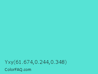 Yxy 61.674,0.244,0.348 Color is a light cyan color and the nearest color is Turquoise #40e0d0. Hex code #56e3d5 and RGB value is rgb(86,227,213). In RGB color space, this color is composed of 34% red, 89% green, 84% blue, In CMYK color space, this color is composed of 62% cyan, 0% magenta, 6% yellow , 11% black , In HSL color space, this color has a hue angle of 174° , 72% saturation and 61% lightness.