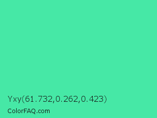 Yxy 61.732,0.262,0.423 Color is a normal green color and the nearest color is Eucalyptus #44d7a8. Hex code #46e8a6 and RGB value is rgb(70,232,166). In RGB color space, this color is composed of 27% red, 91% green, 65% blue, In CMYK color space, this color is composed of 70% cyan, 0% magenta, 28% yellow , 9% black , In HSL color space, this color has a hue angle of 156° , 78% saturation and 59% lightness.