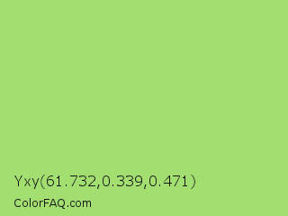 Yxy 61.732,0.339,0.471 Color is a light green color and the nearest color is Inchworm #b2ec5d. Hex code #a3df70 and RGB value is rgb(163,223,112). In RGB color space, this color is composed of 64% red, 87% green, 44% blue, In CMYK color space, this color is composed of 27% cyan, 0% magenta, 50% yellow , 13% black , In HSL color space, this color has a hue angle of 92° , 63% saturation and 66% lightness.