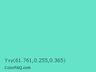 Yxy 61.761,0.255,0.365 Color is a light cyan color and the nearest color is Downy #6fd0c5. Hex code #64e3c8 and RGB value is rgb(100,227,200). In RGB color space, this color is composed of 39% red, 89% green, 78% blue, In CMYK color space, this color is composed of 56% cyan, 0% magenta, 12% yellow , 11% black , In HSL color space, this color has a hue angle of 167° , 69% saturation and 64% lightness.