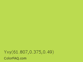 Yxy 61.807,0.375,0.49 Color is a normal lime color and the nearest color is June Bud #bdda57. Hex code #bbdb50 and RGB value is rgb(187,219,80). In RGB color space, this color is composed of 73% red, 86% green, 31% blue, In CMYK color space, this color is composed of 15% cyan, 0% magenta, 63% yellow , 14% black , In HSL color space, this color has a hue angle of 74° , 66% saturation and 59% lightness.