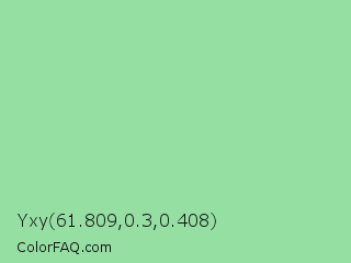 Yxy 61.809,0.3,0.408 Color is a light green color and the nearest color is Teal Deer #99e6b3. Hex code #95dfa3 and RGB value is rgb(149,223,163). In RGB color space, this color is composed of 58% red, 87% green, 64% blue, In CMYK color space, this color is composed of 33% cyan, 0% magenta, 27% yellow , 13% black , In HSL color space, this color has a hue angle of 131° , 54% saturation and 73% lightness.