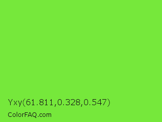 Yxy 61.811,0.328,0.547 Color is a normal green color and the nearest color is Kiwi #8ee53f. Hex code #76e83b and RGB value is rgb(118,232,59). In RGB color space, this color is composed of 46% red, 91% green, 23% blue, In CMYK color space, this color is composed of 49% cyan, 0% magenta, 75% yellow , 9% black , In HSL color space, this color has a hue angle of 100° , 79% saturation and 57% lightness.