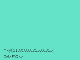 Yxy 61.818,0.255,0.365 Color is a light cyan color and the nearest color is Downy #6fd0c5. Hex code #64e3c8 and RGB value is rgb(100,227,200). In RGB color space, this color is composed of 39% red, 89% green, 78% blue, In CMYK color space, this color is composed of 56% cyan, 0% magenta, 12% yellow , 11% black , In HSL color space, this color has a hue angle of 167° , 69% saturation and 64% lightness.