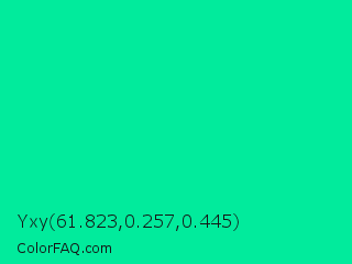 Yxy 61.823,0.257,0.445 Color is a normal green color and the nearest color is Medium Spring Green #00fa9a. Hex code #01eb9c and RGB value is rgb(1,235,156). In RGB color space, this color is composed of 0% red, 92% green, 61% blue, In CMYK color space, this color is composed of 100% cyan, 0% magenta, 34% yellow , 8% black , In HSL color space, this color has a hue angle of 160° , 99% saturation and 46% lightness.