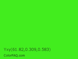 Yxy 61.82,0.309,0.583 Color is a normal green color and the nearest color is Neon Green #39ff14. Hex code #42ed1e and RGB value is rgb(66,237,30). In RGB color space, this color is composed of 26% red, 93% green, 12% blue, In CMYK color space, this color is composed of 72% cyan, 0% magenta, 87% yellow , 7% black , In HSL color space, this color has a hue angle of 110° , 85% saturation and 52% lightness.