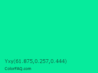 Yxy 61.875,0.257,0.444 Color is a normal green color and the nearest color is Medium Spring Green #00fa9a. Hex code #06eb9c and RGB value is rgb(6,235,156). In RGB color space, this color is composed of 2% red, 92% green, 61% blue, In CMYK color space, this color is composed of 97% cyan, 0% magenta, 34% yellow , 8% black , In HSL color space, this color has a hue angle of 159° , 95% saturation and 47% lightness.