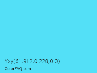 Yxy 61.912,0.228,0.3 Color is a light cyan color and the nearest color is Turquoise Blue #6cdae7. Hex code #53e0f7 and RGB value is rgb(83,224,247). In RGB color space, this color is composed of 33% red, 88% green, 97% blue, In CMYK color space, this color is composed of 66% cyan, 9% magenta, 0% yellow , 3% black , In HSL color space, this color has a hue angle of 188° , 91% saturation and 65% lightness.