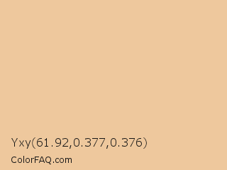 Yxy 61.92,0.377,0.376 Color is a light orange color and the nearest color is Manhattan #f5c999. Hex code #eec89d and RGB value is rgb(238,200,157). In RGB color space, this color is composed of 93% red, 78% green, 62% blue, In CMYK color space, this color is composed of 0% cyan, 16% magenta, 34% yellow , 7% black , In HSL color space, this color has a hue angle of 32° , 70% saturation and 77% lightness.
