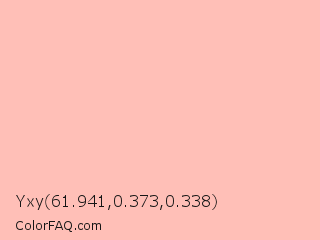 Yxy 61.941,0.373,0.338 Color is a very light red color and the nearest color is Melon #fdbcb4. Hex code #ffbfb7 and RGB value is rgb(255,191,183). In RGB color space, this color is composed of 100% red, 75% green, 72% blue, In CMYK color space, this color is composed of 0% cyan, 25% magenta, 28% yellow , 0% black , In HSL color space, this color has a hue angle of 7° , 100% saturation and 86% lightness.