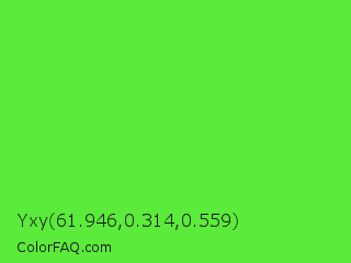 Yxy 61.946,0.314,0.559 Color is a normal green color and the nearest color is Screamin Green #66ff66. Hex code #5beb3a and RGB value is rgb(91,235,58). In RGB color space, this color is composed of 36% red, 92% green, 23% blue, In CMYK color space, this color is composed of 61% cyan, 0% magenta, 75% yellow , 8% black , In HSL color space, this color has a hue angle of 109° , 82% saturation and 57% lightness.