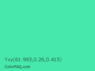 Yxy 61.993,0.26,0.415 Color is a normal green color and the nearest color is Eucalyptus #44d7a8. Hex code #47e8ab and RGB value is rgb(71,232,171). In RGB color space, this color is composed of 28% red, 91% green, 67% blue, In CMYK color space, this color is composed of 69% cyan, 0% magenta, 26% yellow , 9% black , In HSL color space, this color has a hue angle of 157° , 78% saturation and 59% lightness.