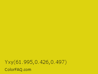 Yxy 61.995,0.426,0.497 Color is a normal yellow color and the nearest color is Barberry #ded717. Hex code #ddd30f and RGB value is rgb(221,211,15). In RGB color space, this color is composed of 87% red, 83% green, 6% blue, In CMYK color space, this color is composed of 0% cyan, 5% magenta, 93% yellow , 13% black , In HSL color space, this color has a hue angle of 57° , 87% saturation and 46% lightness.
