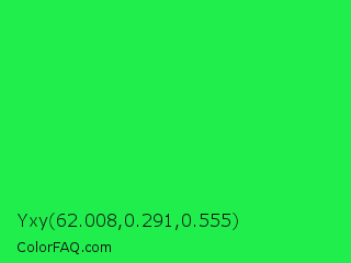 Yxy 62.008,0.291,0.555 Color is a normal green color and the nearest color is Malachite #0bda51. Hex code #20ee4d and RGB value is rgb(32,238,77). In RGB color space, this color is composed of 13% red, 93% green, 30% blue, In CMYK color space, this color is composed of 87% cyan, 0% magenta, 68% yellow , 7% black , In HSL color space, this color has a hue angle of 133° , 86% saturation and 53% lightness.