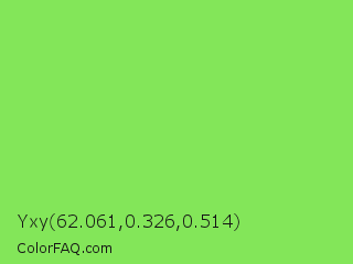 Yxy 62.061,0.326,0.514 Color is a light green color and the nearest color is Kiwi #8ee53f. Hex code #83e659 and RGB value is rgb(131,230,89). In RGB color space, this color is composed of 51% red, 90% green, 35% blue, In CMYK color space, this color is composed of 43% cyan, 0% magenta, 61% yellow , 10% black , In HSL color space, this color has a hue angle of 102° , 74% saturation and 63% lightness.
