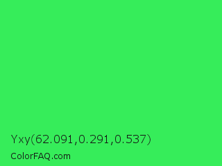 Yxy 62.091,0.291,0.537 Color is a normal green color and the nearest color is UFO Green #3cd070. Hex code #36ed5a and RGB value is rgb(54,237,90). In RGB color space, this color is composed of 21% red, 93% green, 35% blue, In CMYK color space, this color is composed of 77% cyan, 0% magenta, 62% yellow , 7% black , In HSL color space, this color has a hue angle of 132° , 84% saturation and 57% lightness.
