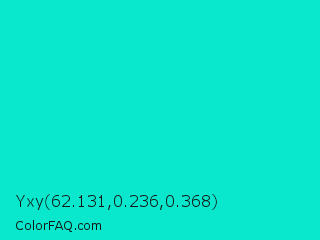 Yxy 62.131,0.236,0.368 Color is a normal cyan color and the nearest color is Bright Turquoise #08e8de. Hex code #09e8cc and RGB value is rgb(9,232,204). In RGB color space, this color is composed of 4% red, 91% green, 80% blue, In CMYK color space, this color is composed of 96% cyan, 0% magenta, 12% yellow , 9% black , In HSL color space, this color has a hue angle of 172° , 93% saturation and 47% lightness.