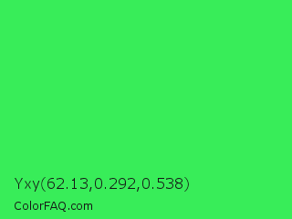 Yxy 62.13,0.292,0.538 Color is a normal green color and the nearest color is UFO Green #3cd070. Hex code #38ed59 and RGB value is rgb(56,237,89). In RGB color space, this color is composed of 22% red, 93% green, 35% blue, In CMYK color space, this color is composed of 76% cyan, 0% magenta, 62% yellow , 7% black , In HSL color space, this color has a hue angle of 131° , 83% saturation and 57% lightness.