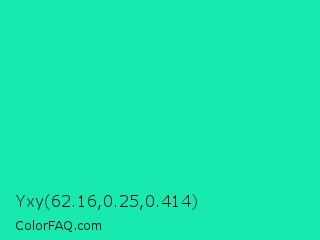 Yxy 62.16,0.25,0.414 Color is a normal green color and the nearest color is Medium Spring Green #00fa9a. Hex code #18eaaf and RGB value is rgb(24,234,175). In RGB color space, this color is composed of 9% red, 92% green, 69% blue, In CMYK color space, this color is composed of 90% cyan, 0% magenta, 25% yellow , 8% black , In HSL color space, this color has a hue angle of 163° , 83% saturation and 51% lightness.