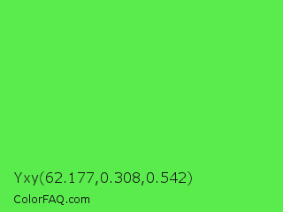 Yxy 62.177,0.308,0.542 Color is a light green color and the nearest color is Screamin Green #66ff66. Hex code #5aeb4d and RGB value is rgb(90,235,77). In RGB color space, this color is composed of 35% red, 92% green, 30% blue, In CMYK color space, this color is composed of 62% cyan, 0% magenta, 67% yellow , 8% black , In HSL color space, this color has a hue angle of 115° , 80% saturation and 61% lightness.