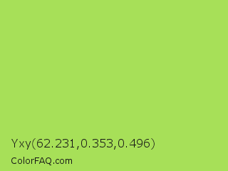 Yxy 62.231,0.353,0.496 Color is a light green color and the nearest color is Conifer #acdd4d. Hex code #a7e058 and RGB value is rgb(167,224,88). In RGB color space, this color is composed of 65% red, 88% green, 35% blue, In CMYK color space, this color is composed of 25% cyan, 0% magenta, 61% yellow , 12% black , In HSL color space, this color has a hue angle of 85° , 69% saturation and 61% lightness.