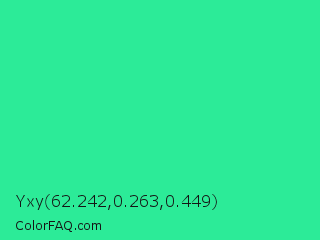 Yxy 62.242,0.263,0.449 Color is a normal green color and the nearest color is Shamrock #33cc99. Hex code #2ceb98 and RGB value is rgb(44,235,152). In RGB color space, this color is composed of 17% red, 92% green, 60% blue, In CMYK color space, this color is composed of 81% cyan, 0% magenta, 35% yellow , 8% black , In HSL color space, this color has a hue angle of 154° , 83% saturation and 55% lightness.