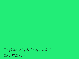 Yxy 62.24,0.276,0.501 Color is a normal green color and the nearest color is Spring Green #00ff7f. Hex code #22ed77 and RGB value is rgb(34,237,119). In RGB color space, this color is composed of 13% red, 93% green, 47% blue, In CMYK color space, this color is composed of 86% cyan, 0% magenta, 50% yellow , 7% black , In HSL color space, this color has a hue angle of 145° , 85% saturation and 53% lightness.