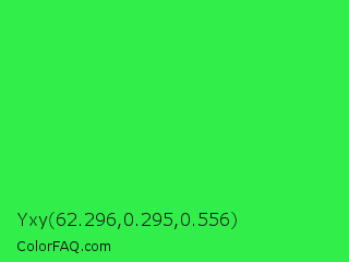 Yxy 62.296,0.295,0.556 Color is a normal green color and the nearest color is Lime Green #32cd32. Hex code #31ee4a and RGB value is rgb(49,238,74). In RGB color space, this color is composed of 19% red, 93% green, 29% blue, In CMYK color space, this color is composed of 79% cyan, 0% magenta, 69% yellow , 7% black , In HSL color space, this color has a hue angle of 128° , 85% saturation and 56% lightness.