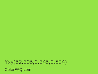 Yxy 62.306,0.346,0.524 Color is a normal green color and the nearest color is Kiwi #8ee53f. Hex code #95e445 and RGB value is rgb(149,228,69). In RGB color space, this color is composed of 58% red, 89% green, 27% blue, In CMYK color space, this color is composed of 35% cyan, 0% magenta, 70% yellow , 11% black , In HSL color space, this color has a hue angle of 90° , 75% saturation and 58% lightness.