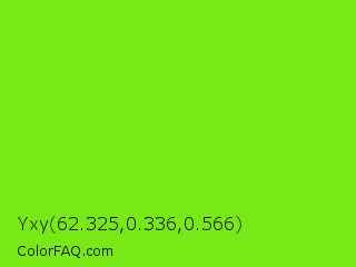 Yxy 62.325,0.336,0.566 Color is a normal green color and the nearest color is Alien Armpit #84de02. Hex code #78e915 and RGB value is rgb(120,233,21). In RGB color space, this color is composed of 47% red, 91% green, 8% blue, In CMYK color space, this color is composed of 48% cyan, 0% magenta, 91% yellow , 9% black , In HSL color space, this color has a hue angle of 92° , 83% saturation and 50% lightness.