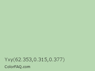 Yxy 62.353,0.315,0.377 Color is a light green color and the nearest color is Sprout #c1d7b0. Hex code #b7d8b1 and RGB value is rgb(183,216,177). In RGB color space, this color is composed of 72% red, 85% green, 69% blue, In CMYK color space, this color is composed of 15% cyan, 0% magenta, 18% yellow , 15% black , In HSL color space, this color has a hue angle of 111° , 33% saturation and 77% lightness.