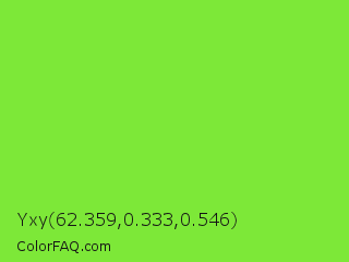 Yxy 62.359,0.333,0.546 Color is a normal green color and the nearest color is Kiwi #8ee53f. Hex code #7de838 and RGB value is rgb(125,232,56). In RGB color space, this color is composed of 49% red, 91% green, 22% blue, In CMYK color space, this color is composed of 46% cyan, 0% magenta, 76% yellow , 9% black , In HSL color space, this color has a hue angle of 96° , 79% saturation and 56% lightness.