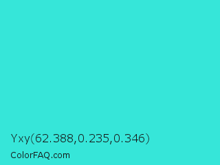 Yxy 62.388,0.235,0.346 Color is a normal cyan color and the nearest color is Turquoise #40e0d0. Hex code #36e6d9 and RGB value is rgb(54,230,217). In RGB color space, this color is composed of 21% red, 90% green, 85% blue, In CMYK color space, this color is composed of 77% cyan, 0% magenta, 6% yellow , 10% black , In HSL color space, this color has a hue angle of 176° , 78% saturation and 56% lightness.