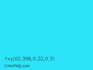 Yxy 62.398,0.22,0.3 Color is a normal cyan color and the nearest color is Loeen #15f2fd. Hex code #2de3fa and RGB value is rgb(45,227,250). In RGB color space, this color is composed of 18% red, 89% green, 98% blue, In CMYK color space, this color is composed of 82% cyan, 9% magenta, 0% yellow , 2% black , In HSL color space, this color has a hue angle of 187° , 95% saturation and 58% lightness.