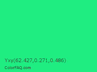 Yxy 62.427,0.271,0.486 Color is a normal green color and the nearest color is Spring Green #00ff7f. Hex code #1eed82 and RGB value is rgb(30,237,130). In RGB color space, this color is composed of 12% red, 93% green, 51% blue, In CMYK color space, this color is composed of 87% cyan, 0% magenta, 45% yellow , 7% black , In HSL color space, this color has a hue angle of 149° , 85% saturation and 52% lightness.