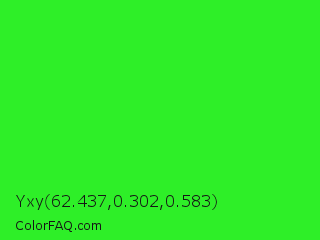 Yxy 62.437,0.302,0.583 Color is a normal green color and the nearest color is Neon Green #39ff14. Hex code #2eef28 and RGB value is rgb(46,239,40). In RGB color space, this color is composed of 18% red, 94% green, 16% blue, In CMYK color space, this color is composed of 81% cyan, 0% magenta, 83% yellow , 6% black , In HSL color space, this color has a hue angle of 118° , 86% saturation and 55% lightness.