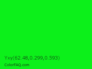 Yxy 62.48,0.299,0.593 Color is a normal green color and the nearest color is Green #00ff00. Hex code #0cf01a and RGB value is rgb(12,240,26). In RGB color space, this color is composed of 5% red, 94% green, 10% blue, In CMYK color space, this color is composed of 95% cyan, 0% magenta, 89% yellow , 6% black , In HSL color space, this color has a hue angle of 124° , 90% saturation and 49% lightness.