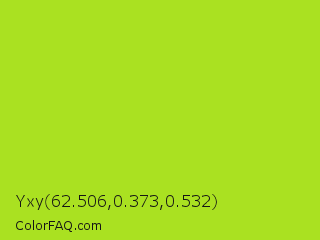 Yxy 62.506,0.373,0.532 Color is a normal lime color and the nearest color is Inch Worm #b0e313. Hex code #aae121 and RGB value is rgb(170,225,33). In RGB color space, this color is composed of 67% red, 88% green, 13% blue, In CMYK color space, this color is composed of 24% cyan, 0% magenta, 85% yellow , 12% black , In HSL color space, this color has a hue angle of 77° , 76% saturation and 51% lightness.