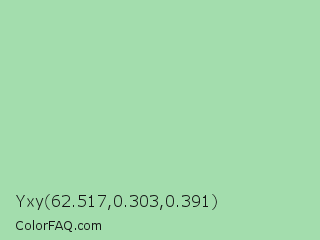 Yxy 62.517,0.303,0.391 Color is a light green color and the nearest color is Celadon #ace1af. Hex code #a3ddad and RGB value is rgb(163,221,173). In RGB color space, this color is composed of 64% red, 87% green, 68% blue, In CMYK color space, this color is composed of 26% cyan, 0% magenta, 22% yellow , 13% black , In HSL color space, this color has a hue angle of 130° , 46% saturation and 75% lightness.