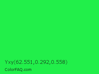 Yxy 62.551,0.292,0.558 Color is a normal green color and the nearest color is Malachite #0bda51. Hex code #21ef4a and RGB value is rgb(33,239,74). In RGB color space, this color is composed of 13% red, 94% green, 29% blue, In CMYK color space, this color is composed of 86% cyan, 0% magenta, 69% yellow , 6% black , In HSL color space, this color has a hue angle of 132° , 87% saturation and 53% lightness.