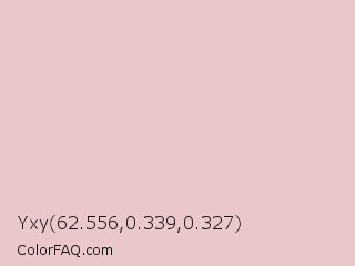 Yxy 62.556,0.339,0.327 Color is a very light red color and the nearest color is Dust Storm #e5ccc9. Hex code #eac7c9 and RGB value is rgb(234,199,201). In RGB color space, this color is composed of 92% red, 78% green, 79% blue, In CMYK color space, this color is composed of 0% cyan, 15% magenta, 14% yellow , 8% black , In HSL color space, this color has a hue angle of 357° , 45% saturation and 85% lightness.
