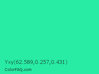 Yxy 62.589,0.257,0.431 Color is a normal green color and the nearest color is Eucalyptus #44d7a8. Hex code #28eba4 and RGB value is rgb(40,235,164). In RGB color space, this color is composed of 16% red, 92% green, 64% blue, In CMYK color space, this color is composed of 83% cyan, 0% magenta, 30% yellow , 8% black , In HSL color space, this color has a hue angle of 158° , 83% saturation and 54% lightness.