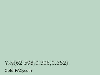 Yxy 62.598,0.306,0.352 Color is a light green color and the nearest color is Surf #bbd7c1. Hex code #bbd6c3 and RGB value is rgb(187,214,195). In RGB color space, this color is composed of 73% red, 84% green, 76% blue, In CMYK color space, this color is composed of 13% cyan, 0% magenta, 9% yellow , 16% black , In HSL color space, this color has a hue angle of 138° , 25% saturation and 79% lightness.
