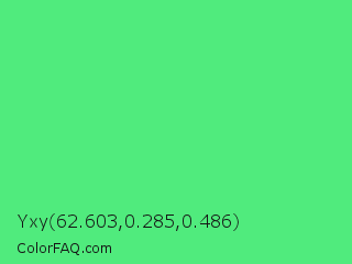 Yxy 62.603,0.285,0.486 Color is a light green color and the nearest color is Very Light Malachite Green #64e986. Hex code #50eb7d and RGB value is rgb(80,235,125). In RGB color space, this color is composed of 31% red, 92% green, 49% blue, In CMYK color space, this color is composed of 66% cyan, 0% magenta, 47% yellow , 8% black , In HSL color space, this color has a hue angle of 137° , 79% saturation and 62% lightness.